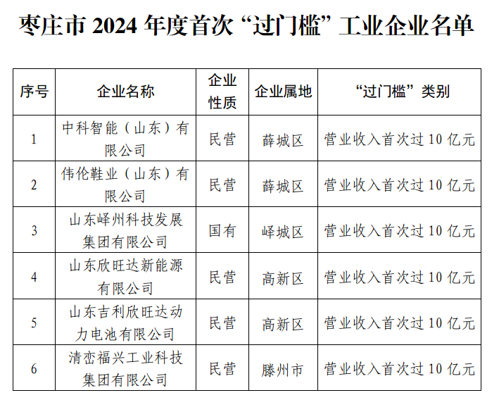 按照“企业自愿”和“属地原则”,经初审推荐、审核认定、名单公示等有关程序,中科智能(山东)有限公司、伟伦鞋业(山东)有限公司、山东吉利欣旺达动力电池有限公司、山东欣旺达新能源有限公司、清峦福兴工业科技集团有限公司、山东峄州科技发展集团有限公司等6家企业符合首次“过门槛”奖励政策条件。经研究,现将枣庄市2024年度首次“过门槛”工业企业名单予以公布。