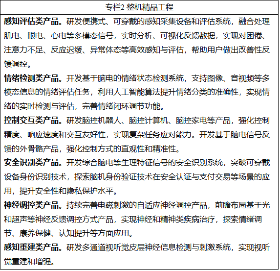 (六)发展辅助设备。研发辅助生理信号设备,通过脑信号与肌电、眼电、心电、近红外等多模态信号的融合,提升交互控制和感知觉评估的精准度。研发用于植入脑机接口的高精度手术机器人,突破亚微米级精度控制与动态调整技术,提升区域精准实时成像与三维重建能力。