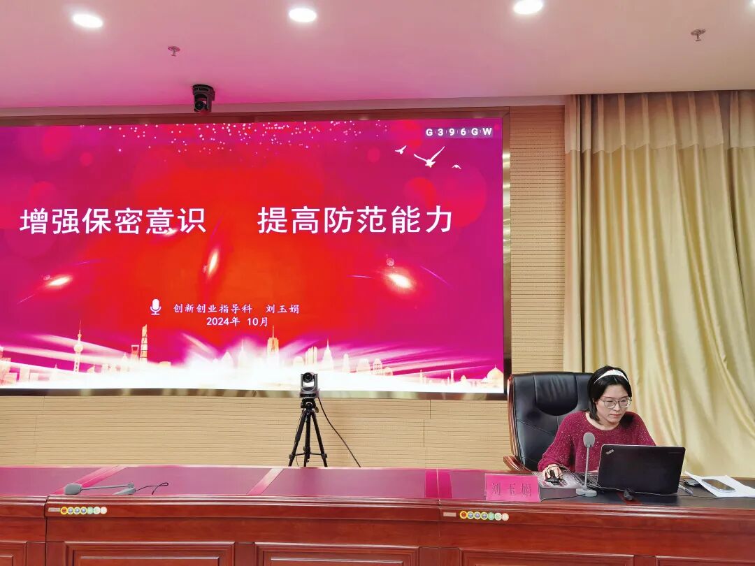 创新创业指导科科长刘玉娟作《增强保密意识 提高防范能力》专题授课,从保密法的修订、保密的基本知识、泄密应当追究的法律责任和如何防范泄密事件的发生四个方面入手,详细讲解了《保密法》修订的重大意义和《保密法》有关条例,结合真实案例深刻剖析了日常工作中可能存在的失泄密隐患和严重后果,系统性地提出防范失泄密事件发生的具体举措。