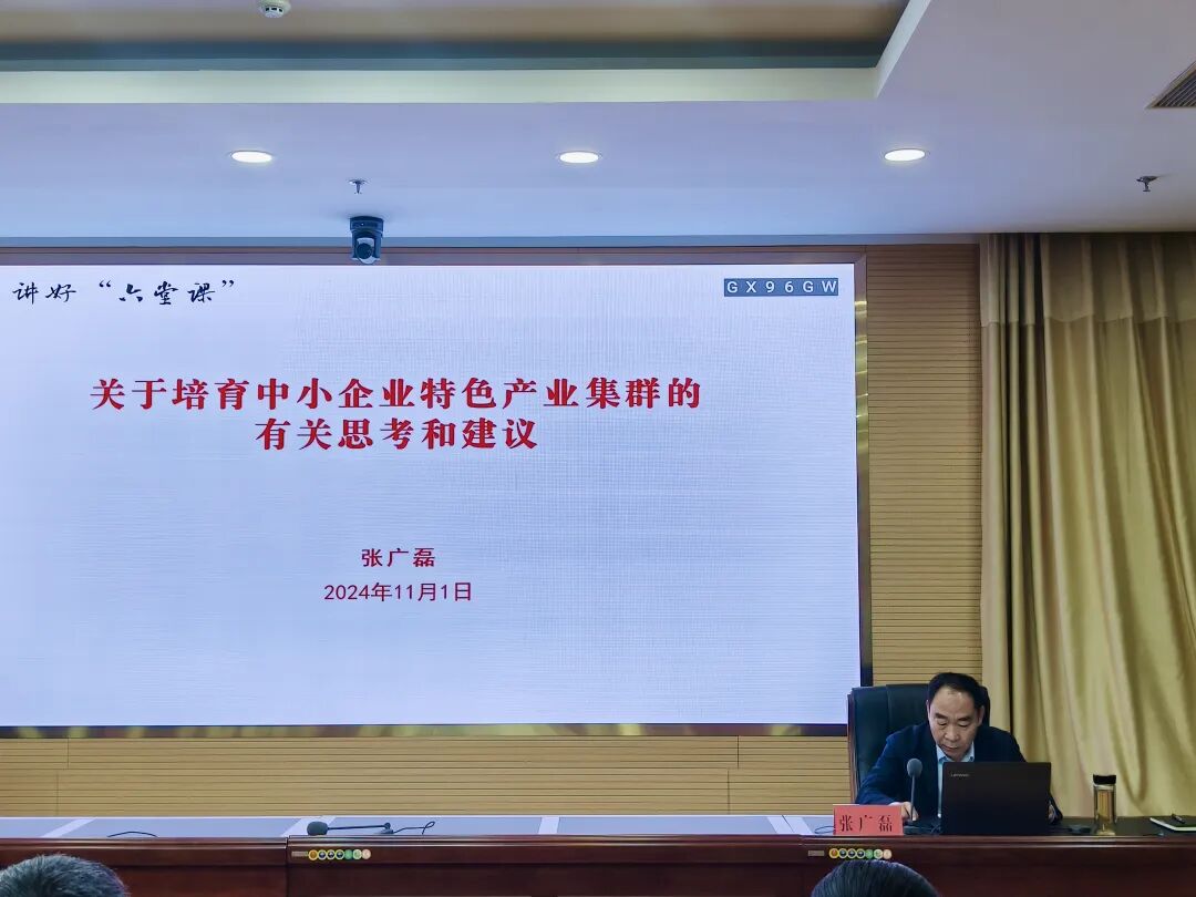 市工信局党组成员、副局长张广磊作《关于培育中小企业特色产业集群的有关思考和建议》专题授课,详细讲解了中小企业特色产业集群的概念、国家支持政策、国内外先进地区产业集群的发展情况,深入分析了我市特色产业集群培育现状、存在问题,对全面提升产业链现代化水平、打造全产业链发展格局、建立产业链稳定发展长效机制提出了措施建议。