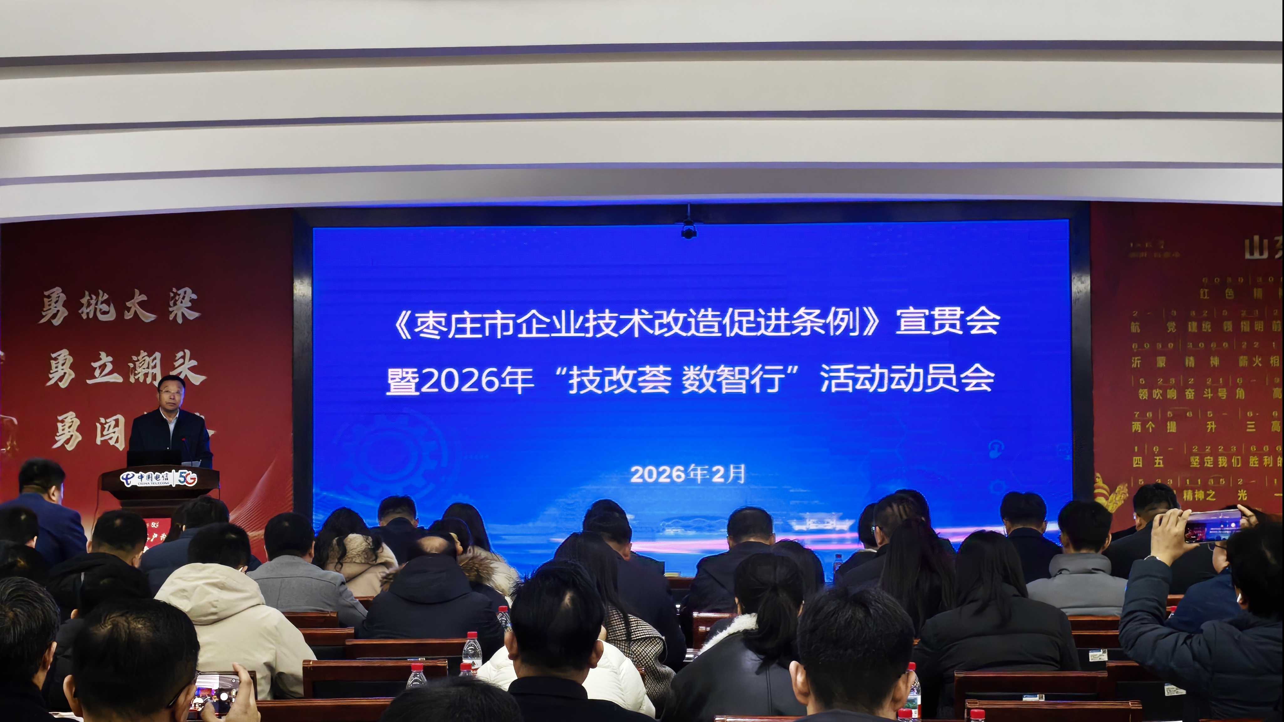 为深入贯彻落实市委、市政府“服务企业年”动员大会精神,紧扣强工兴产、转型发展工作主线,以法治赋能、精准服务推动惠企政策直达快享,2月28日,市工信局组织召开《枣庄市企业技术改造促进条例》宣贯会暨2026年“技改荟 数智行”活动动员会,市工信局党组成员、副局长王家贺主持会议。特别邀请省工信厅技改处一级主任科员王海波、市统计局投资科科长高丽君到会指导,各区(市)工信局、枣庄高新区经发局分管负责人及相关科室负责人参加会议。